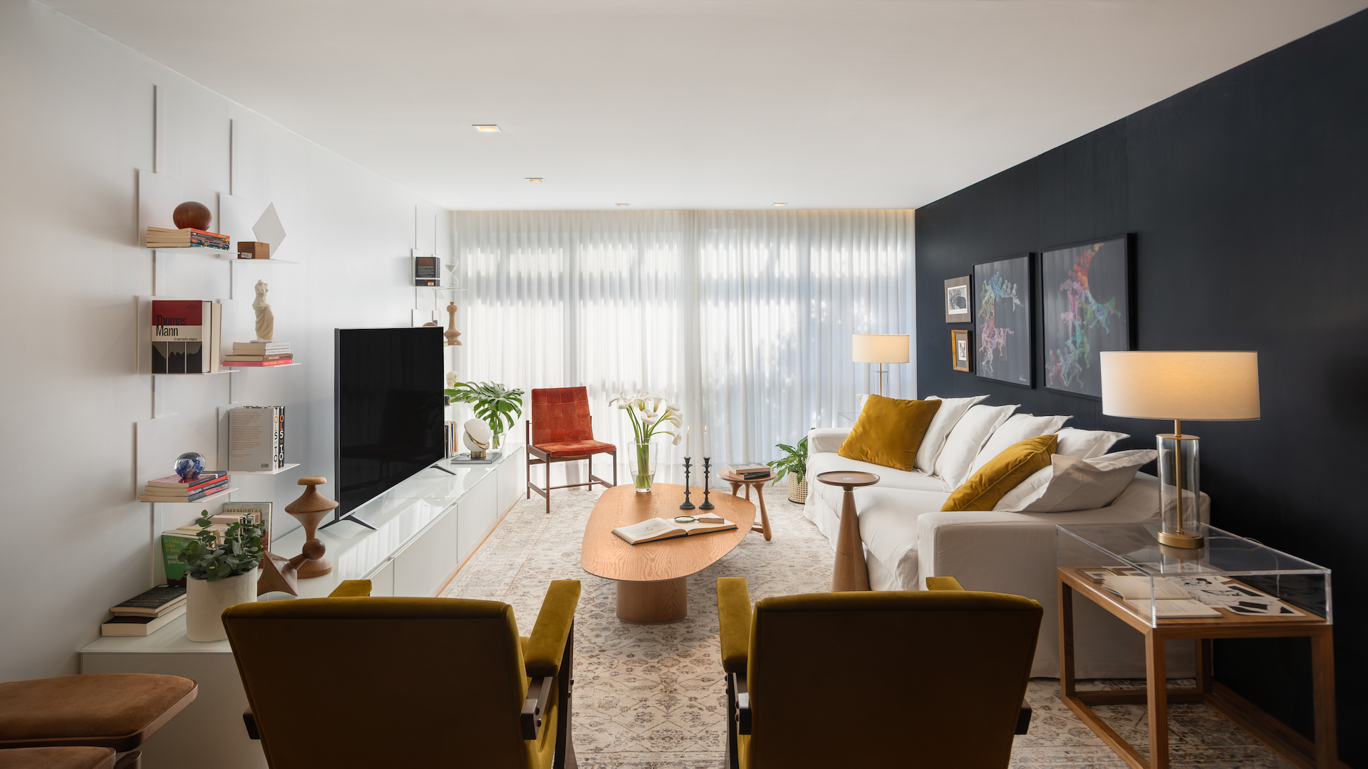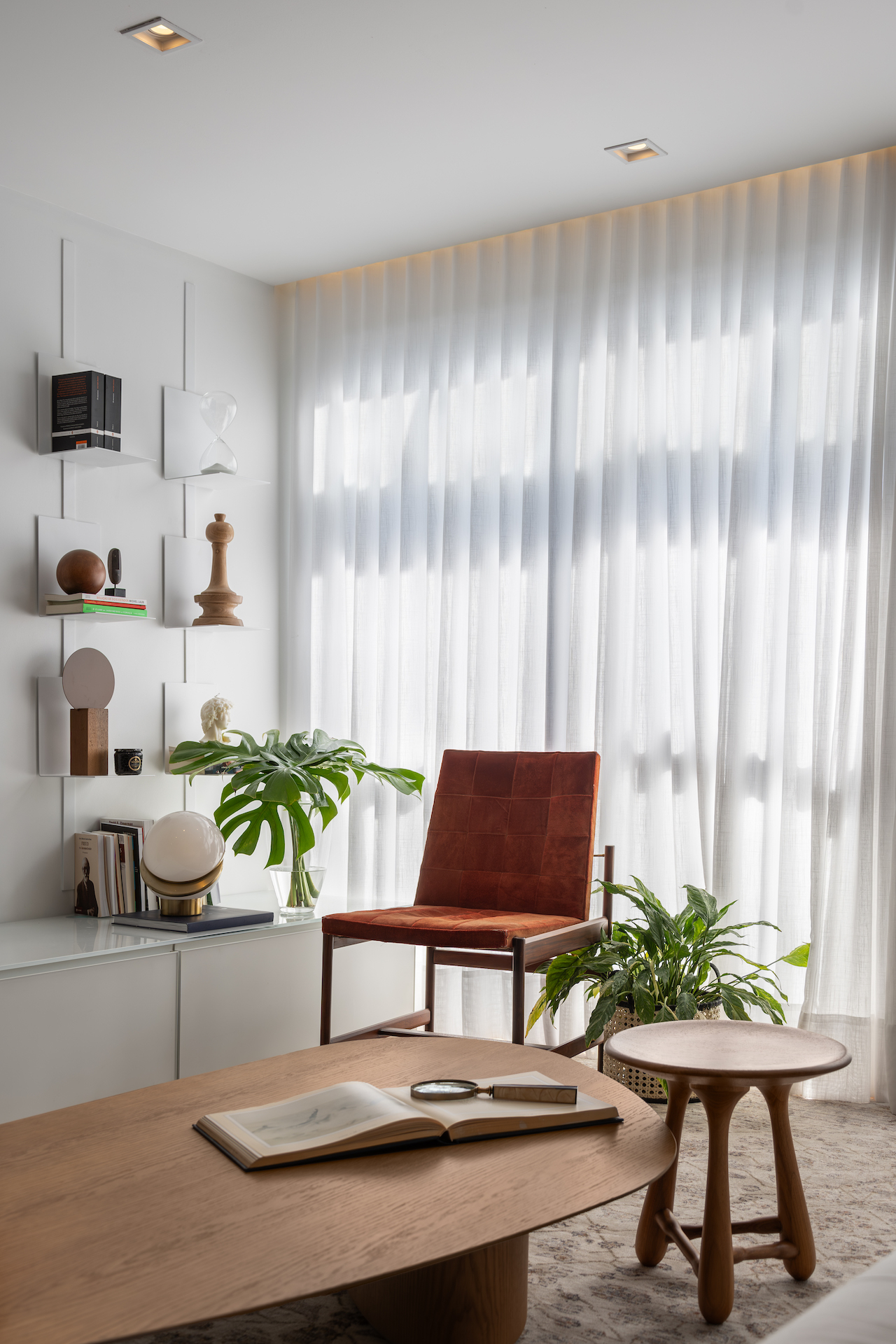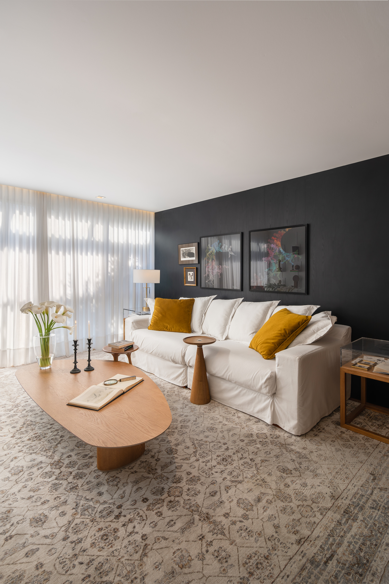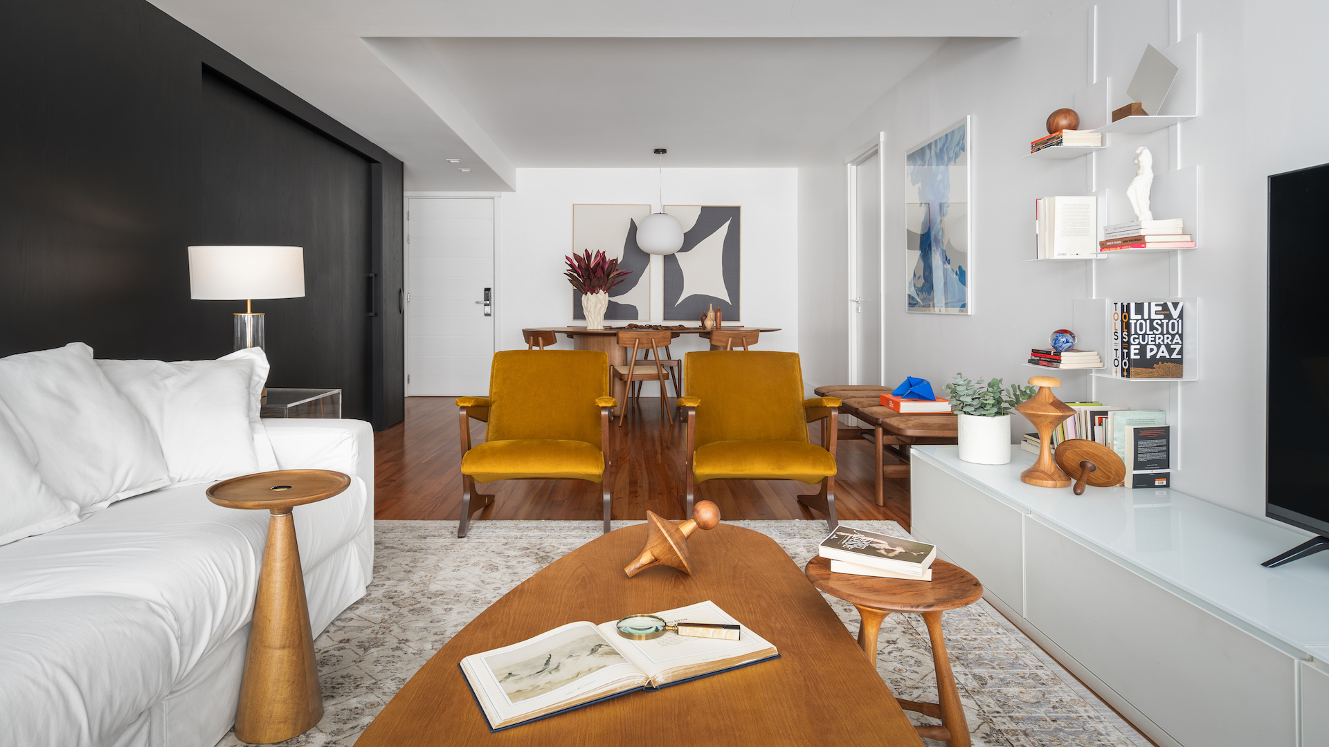 Projetado para um psiquiatra que aprecia receber amigos e valoriza design assinado, este ambiente combina funcionalidade, estética moderna e soluções personalizadas, criando um espaço elegante e acolhedor. Destaque para as poltronas de Zanine Caldas, revestidas em veludo dourado, que adicionam sofisticação ao living. O sofá com capa de sarja traz praticidade ao dia a dia, enquanto as prateleiras metálicas sob medida, desenhadas pelo escritório, organizam o acervo de livros e objetos decorativos do cliente com elegância. Para complementar a composição, as mesas laterais exclusivas, com base em freijó e tampo de acrílico, foram projetadas por nós para expor suas memórias e coleções. As paredes brancas predominam no ambiente, proporcionando amplitude e iluminação, enquanto o painel de marcenaria ebanizada cria um contraste sofisticado, reforçando a atmosfera aconchegante e atemporal do projeto.