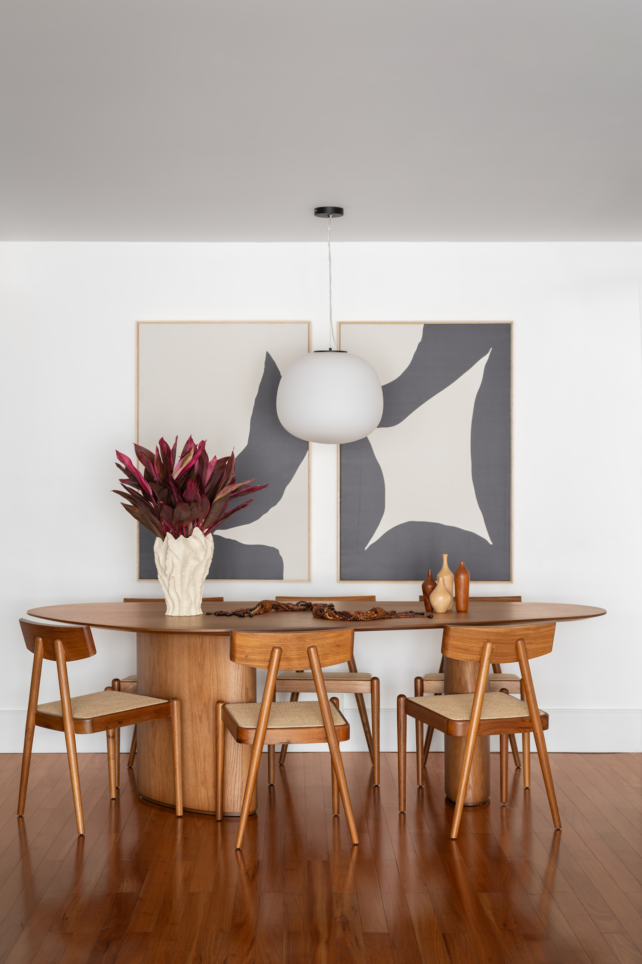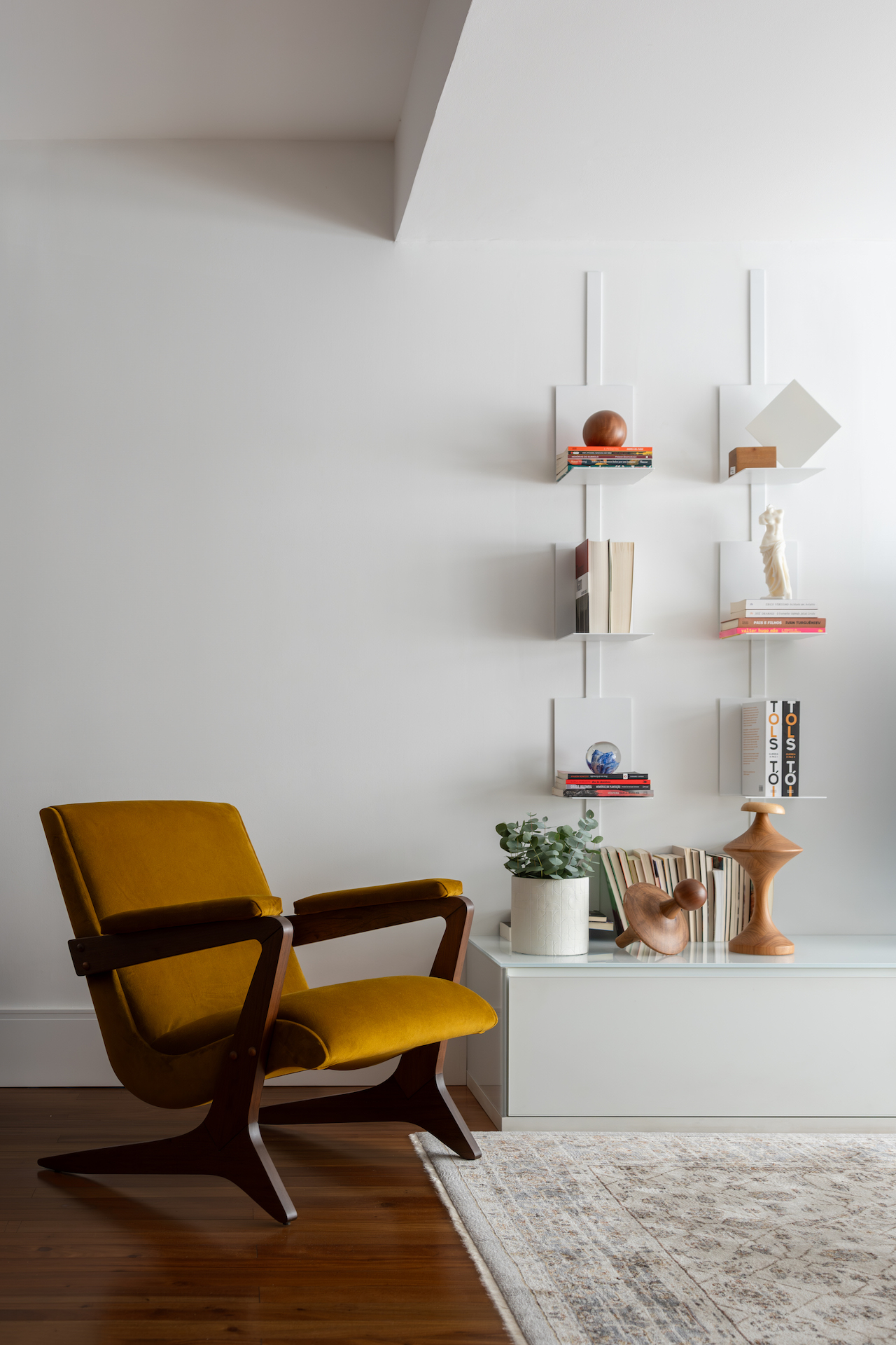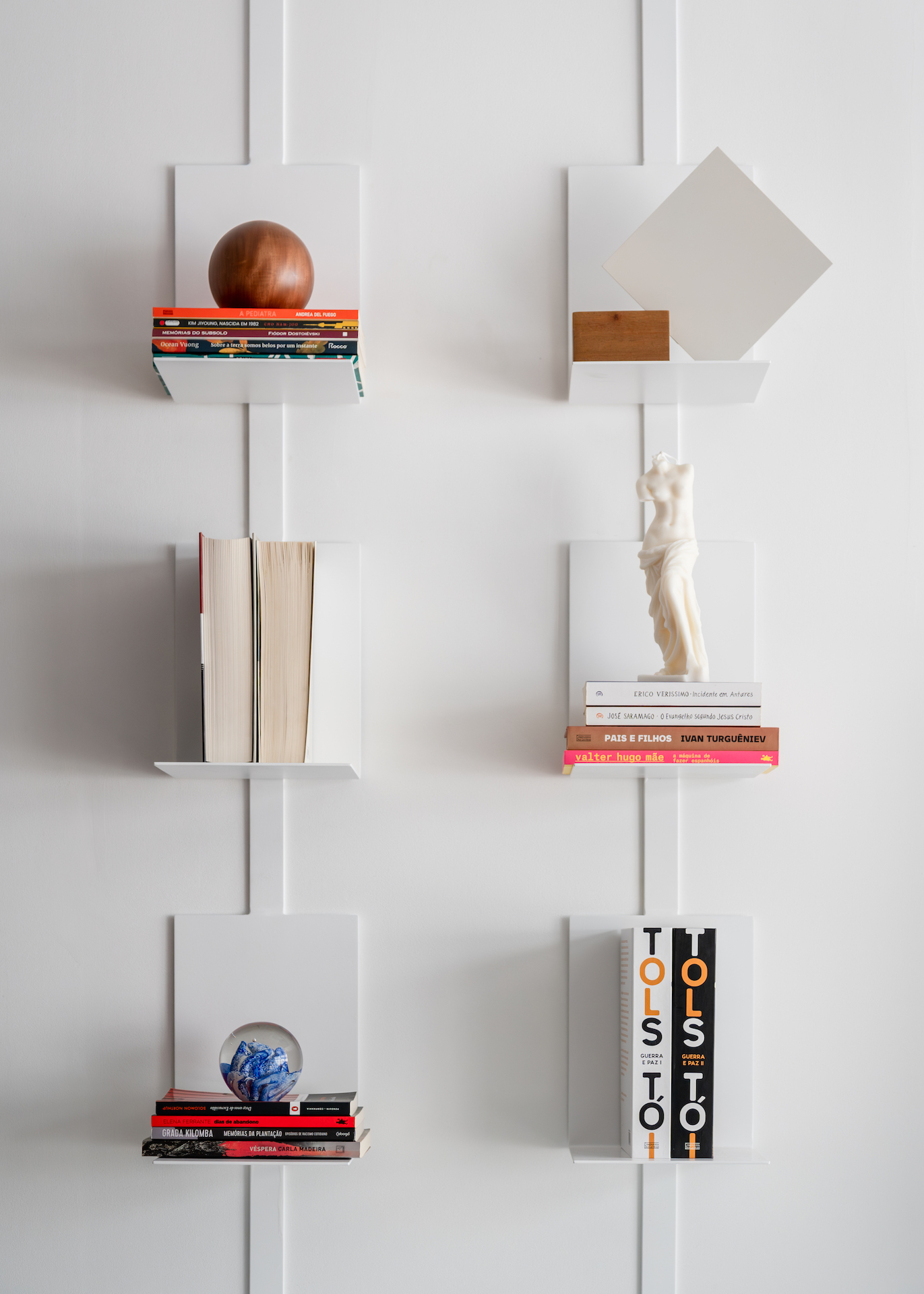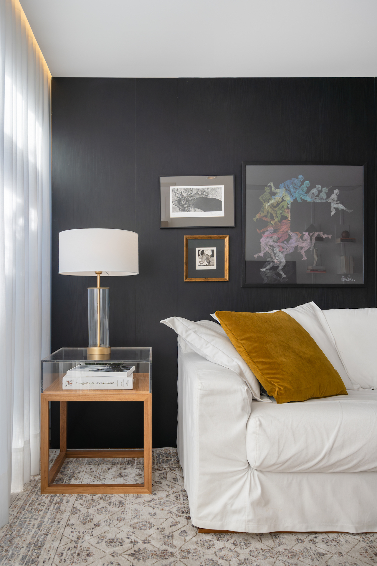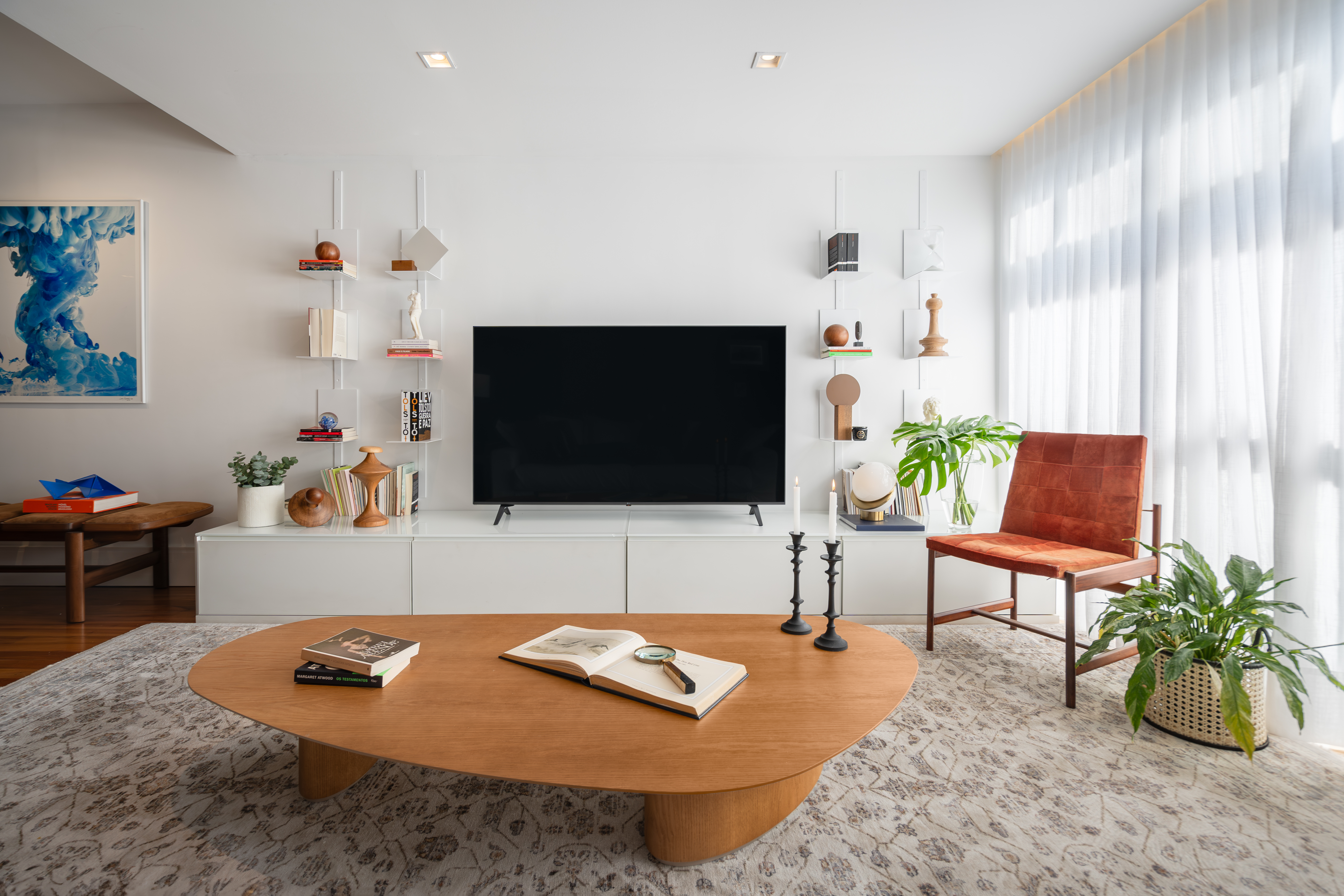 Projetado para um psiquiatra que aprecia receber amigos e valoriza design assinado, este ambiente combina funcionalidade, estética moderna e soluções personalizadas, criando um espaço elegante e acolhedor. Destaque para as poltronas de Zanine Caldas, revestidas em veludo dourado, que adicionam sofisticação ao living. O sofá com capa de sarja traz praticidade ao dia a dia, enquanto as prateleiras metálicas sob medida, desenhadas pelo escritório, organizam o acervo de livros e objetos decorativos do cliente com elegância. Para complementar a composição, as mesas laterais exclusivas, com base em freijó e tampo de acrílico, foram projetadas por nós para expor suas memórias e coleções. As paredes brancas predominam no ambiente, proporcionando amplitude e iluminação, enquanto o painel de marcenaria ebanizada cria um contraste sofisticado, reforçando a atmosfera aconchegante e atemporal do projeto.